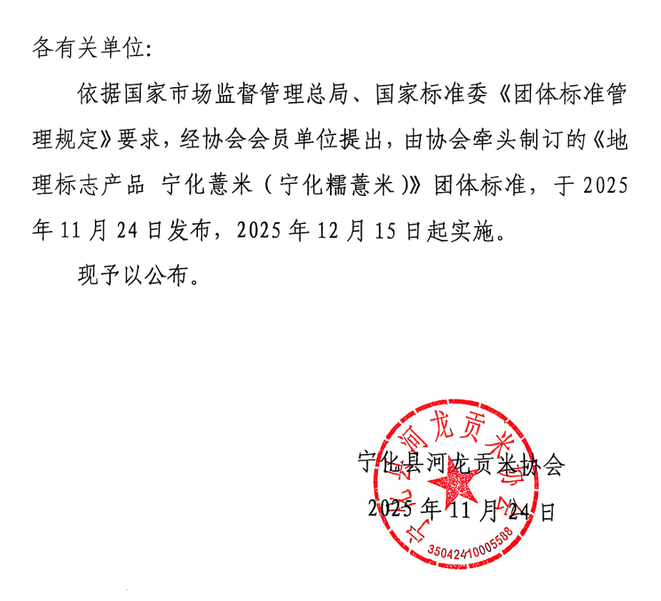 关于批准发布《地理标志产品 宁化薏米(宁化糯薏米)》团体标准的公告