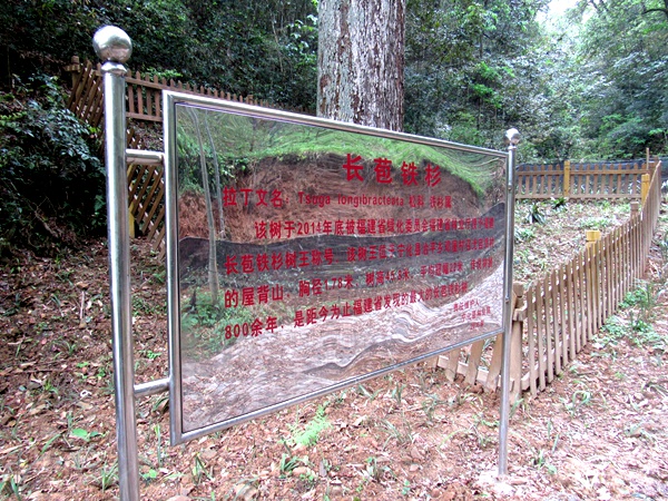 长苞铁杉是松科植物的残遗种类,常绿乔木,被列为国家二级保护植物。这株中国最美长苞铁杉古树位于宁化县治平畲族乡邓屋村召光自然村的屋背山,其胸径1.78米,树高45.8米,冠幅22米,树龄800余年,曾被福建省绿化委员会、福建省林业厅评为“福建长苞铁杉王”。