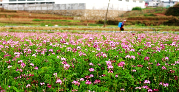 紫云英又名绿肥,是中国传统的有机肥料之一,为了种植绿色优质晚稻,淮土镇农技站在全镇积极推广紫云英作肥料,以提高农田肥力和稻米品质。(李梦玲)