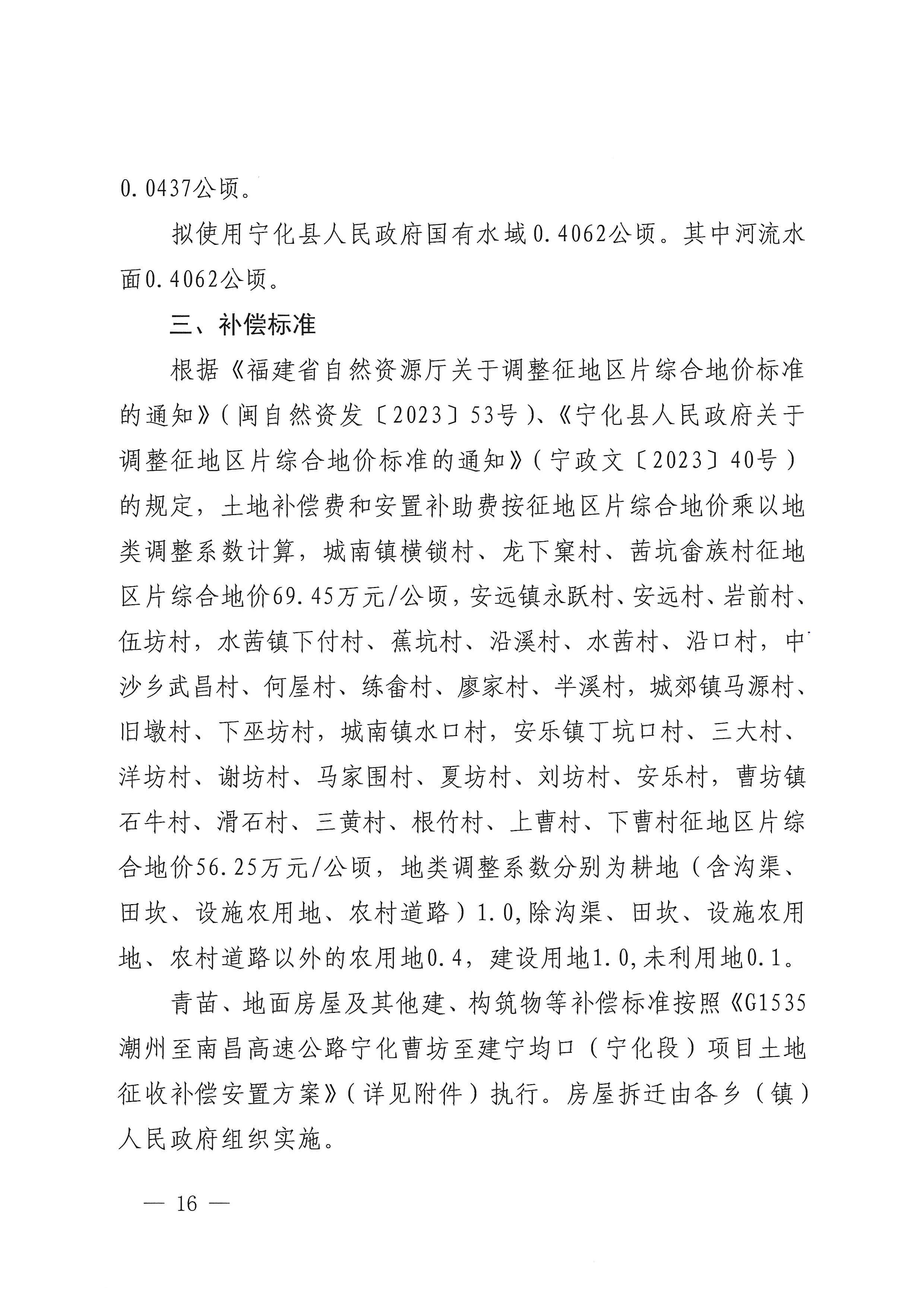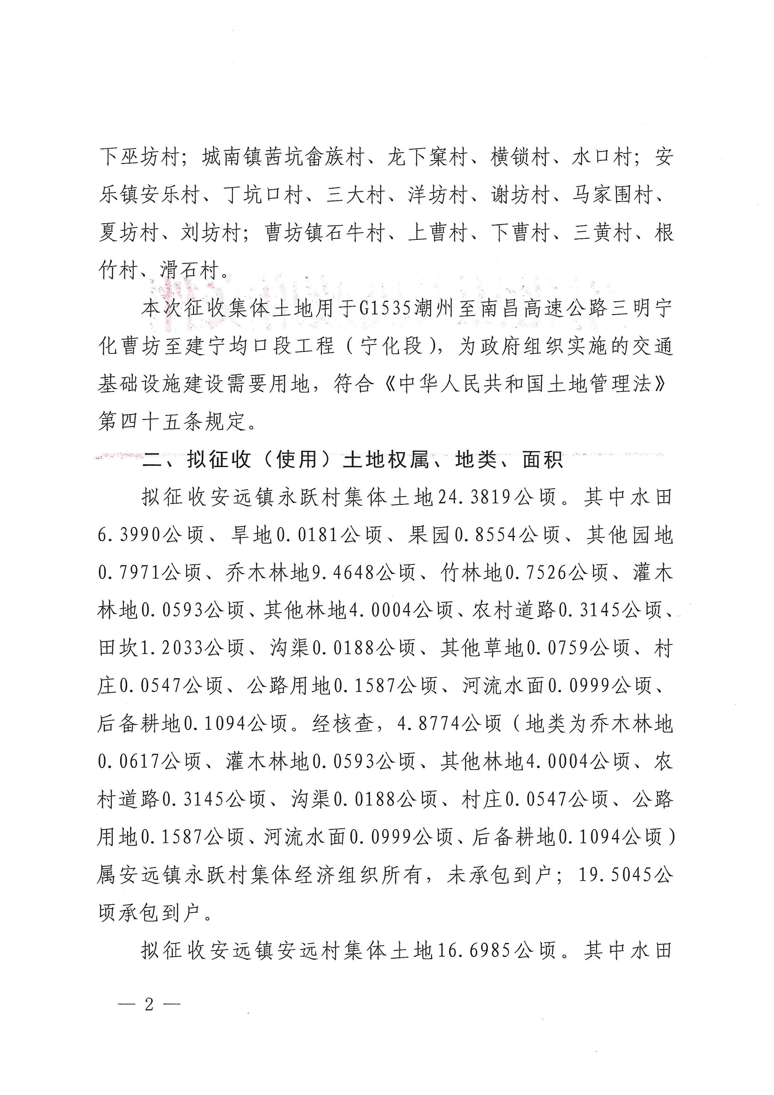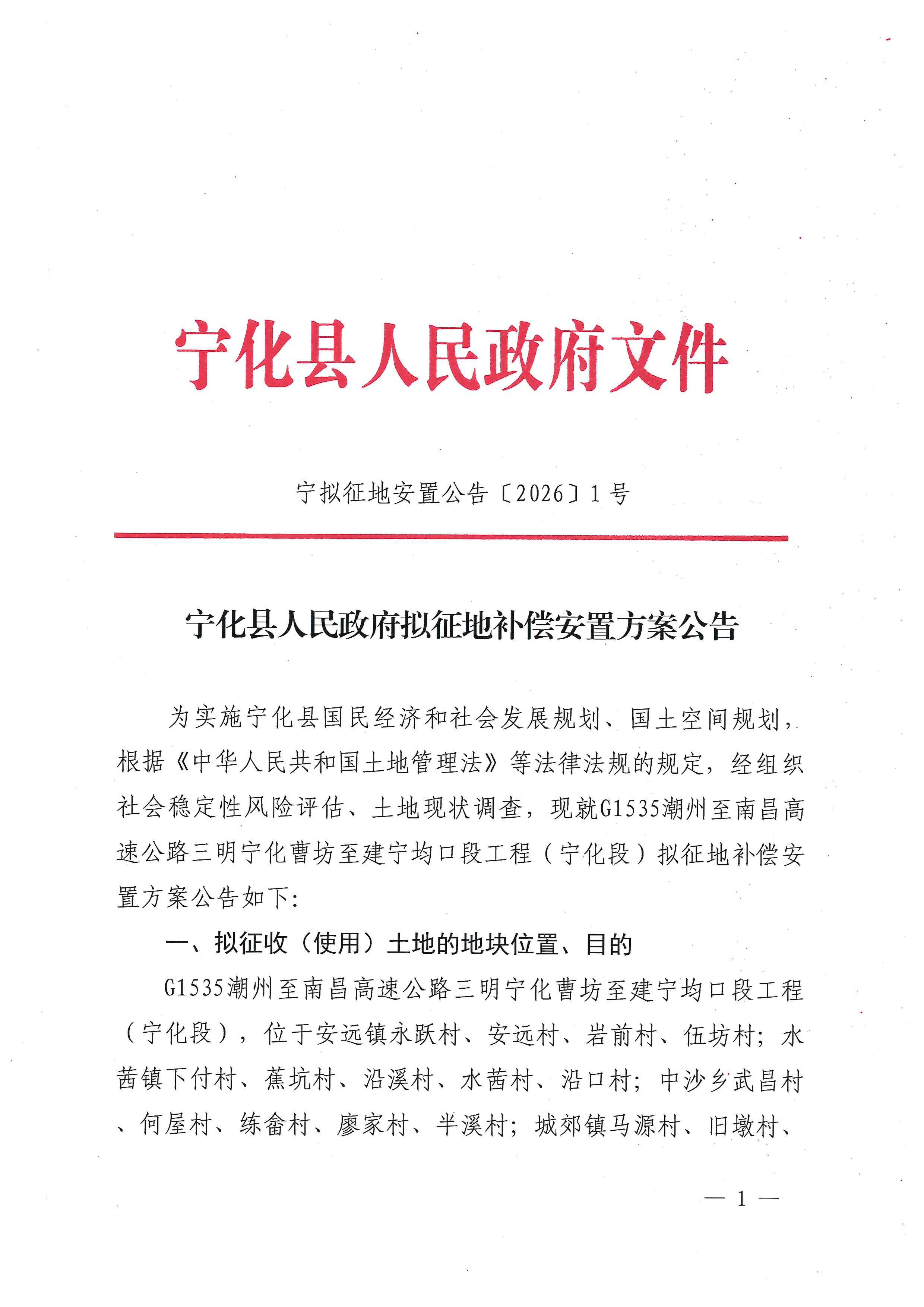 宁化县人民政府拟征地补偿安置方案公告(宁拟征地安置公告〔2026〕1号)