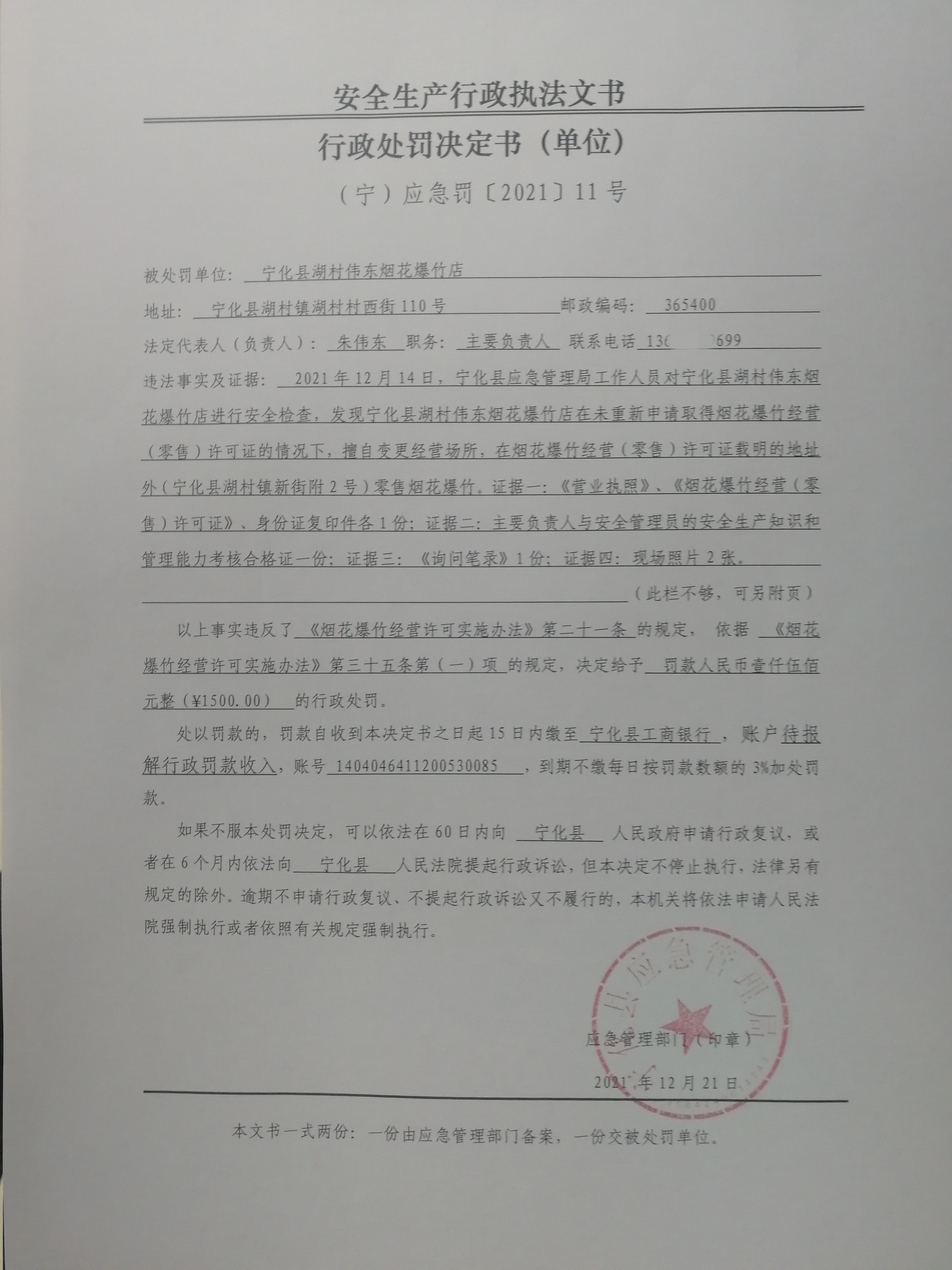 宁化县应急管理局2021年度行政处罚信息公示(七)